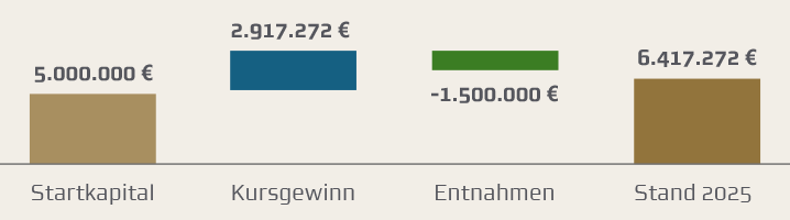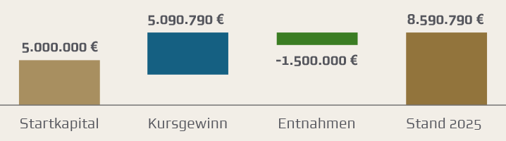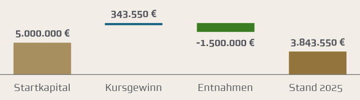 Stellen Sie sich vor, Sie hätten 2015, also vor genau 10 Jahren, einen Betrag von 5 Millionen Euro zur Verfügung gehabt – was hätte daraus werden können, wenn Sie seitdem mit jährlichen Entnahmen von 150.000 Euro Ihren Lebensunterhalt bestritten und mit durchschnittlich 2 % Inflation zu kämpfen gehabt hätten?